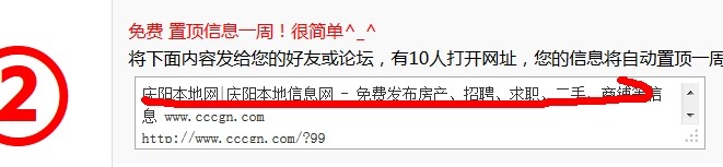 发完帖子后出现别急!还可以免费置顶一周这个对话框时,里面的文字标题全部是网站的宣传(红色划线部分),我觉得应该修改为发布帖子的标题,在配合该信息帖的伪静态后的网址,这样 网民更加愿意复制 转发,不要 现在这样 人家感觉全部是我们自己网站的宣传,有些人反应 发到群里面 大家非常容易反感