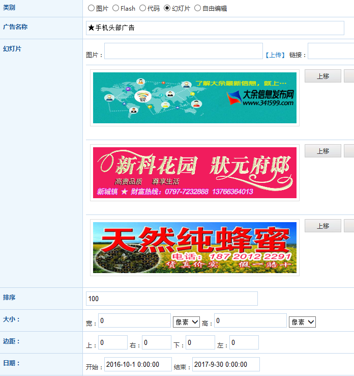 手机头部幻灯片广告显示问题,设置了没有显示,是什么原因呢?还是哪里没有设置好呢?我现在的设置如下图: