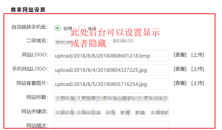 九、在商家建站里,大红框的部分,后台能设置显示/隐藏,因为有些客户不懂又喜欢乱改,造成SEO信息被改动