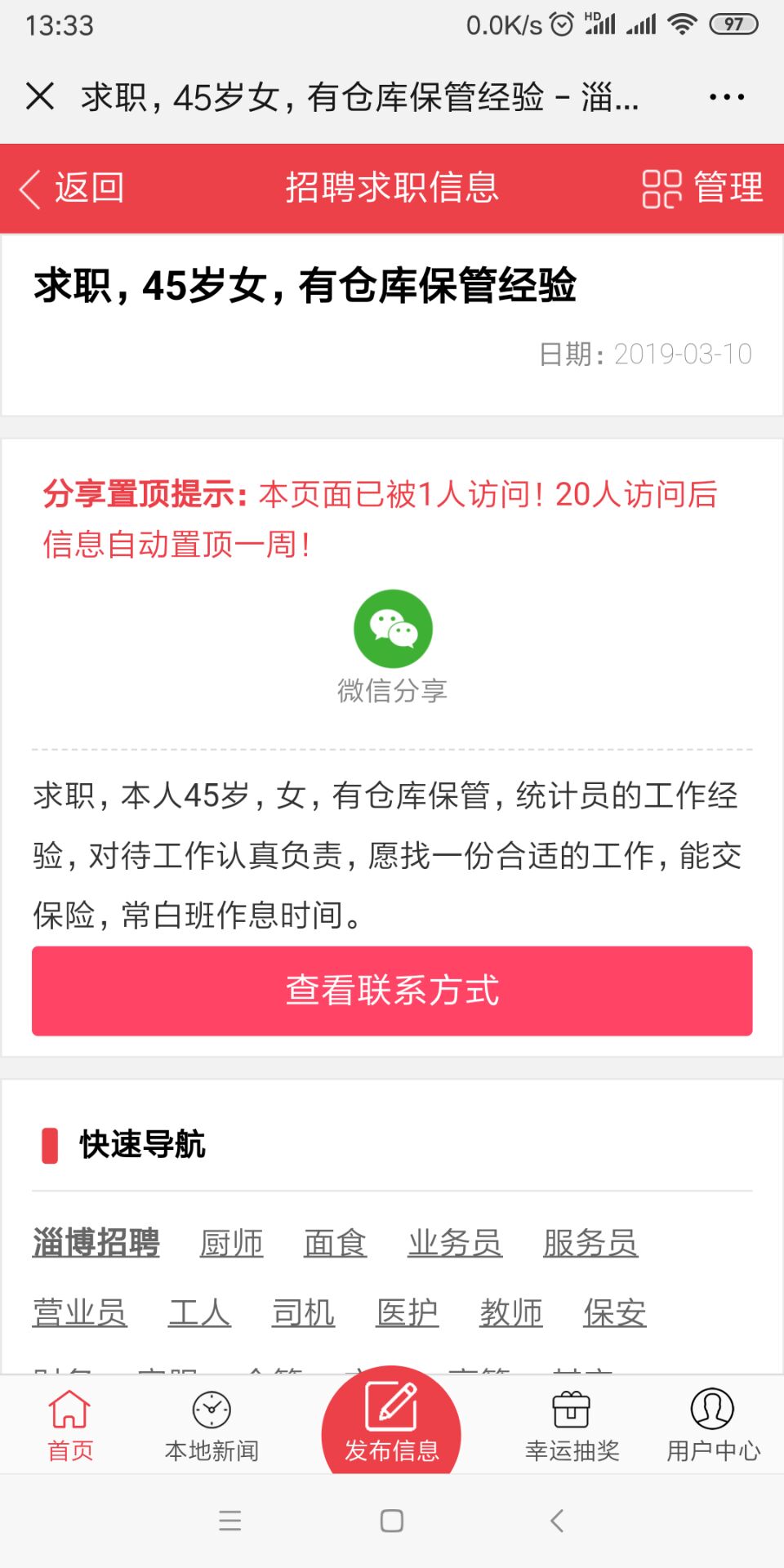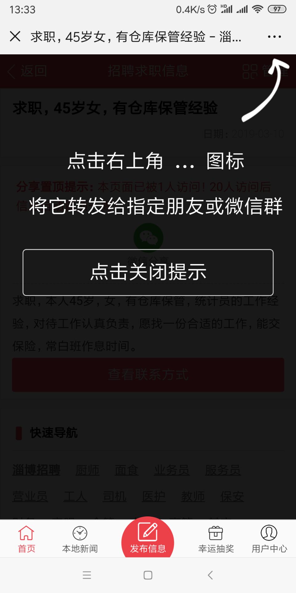 发布信息后,微信扫一扫分享置顶,不够人性化。很少有人去注意那个微信分享图标,更懒得再去点击。