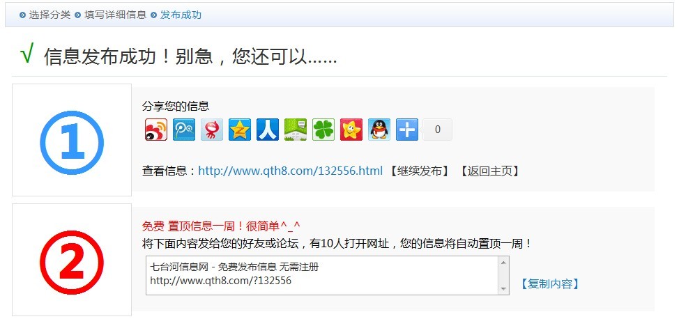 发布信息后网友还能做些什么?关掉页面走人?当然不是,网友还可以把信息分享到自己的博客和空间上,即增加了展示途径,又实现了对网站的宣传。当然,网友依然能实现免费置顶信息一周。