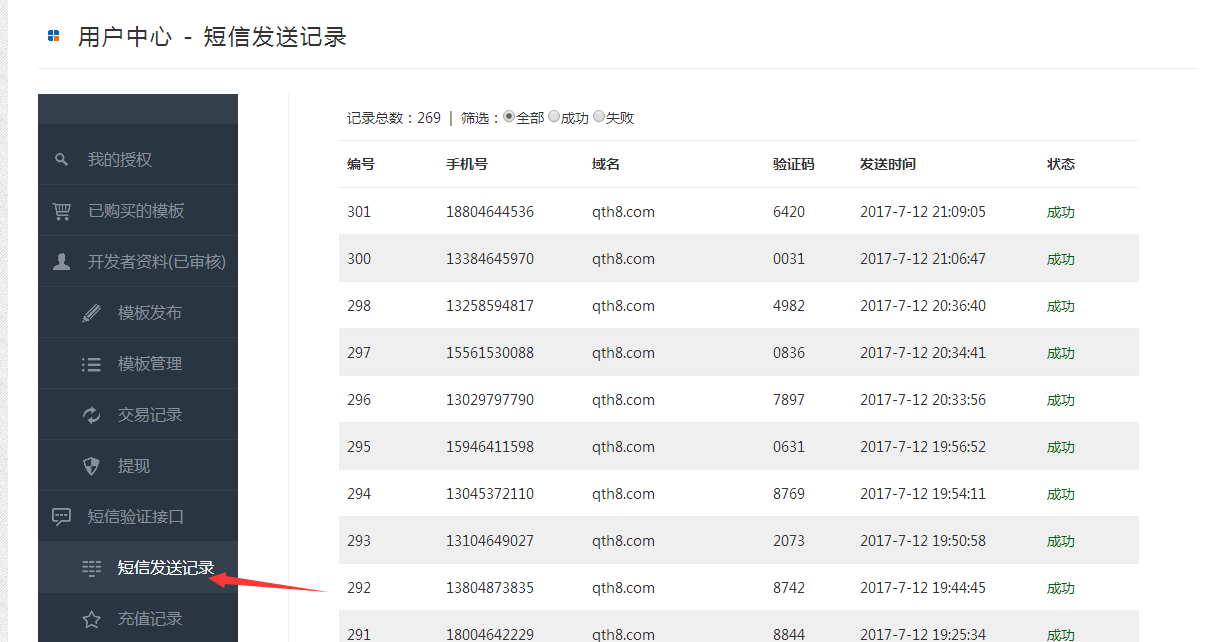 状态显示成功的是短信已发送成功,但用户没有提交认证。
