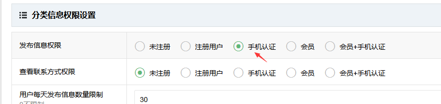 把发布信息权限设置为手机认证,这样,用户要发布信息就要先手机认证了