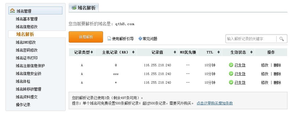 好了,下面教大家怎么做泛解析,首先需要域名支持,现在注册的域名基本上都是支持的。