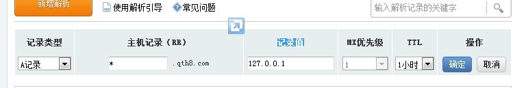 新增解析 - 增加一个A记录解析 - 主机记录(RR)中写“*”代表所有下级域名,记录值中写要指向的IP。点确定,这样泛解析就做好了。
