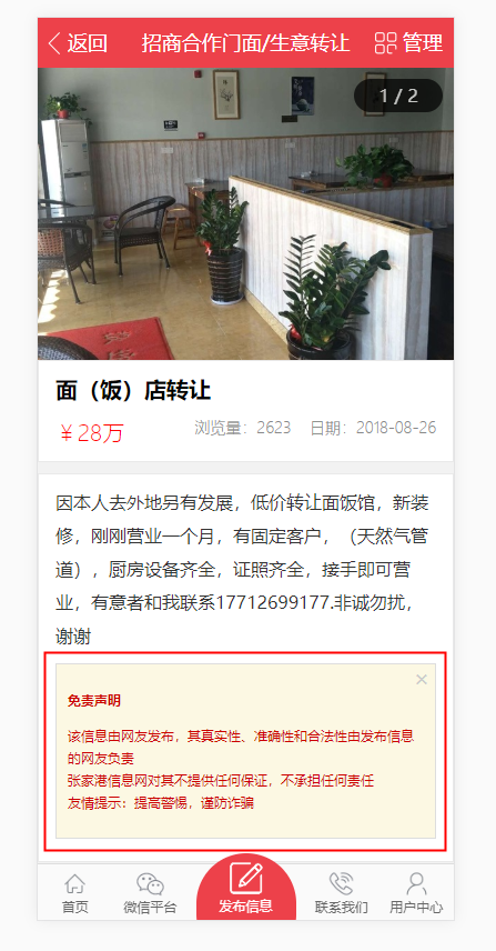 <p> 该信息由用户自行发布,其真实性、准确性和合法性由信息发布者负责。XXX信息网仅提供信息交流平台,不介入任何交易过程,使用信息时请务必提高警惕。强烈建议:拒绝预付费用、选择见面交易、核验证照资质、签订交易合同。警方提示:警惕网络黑手,谨防网络诈骗