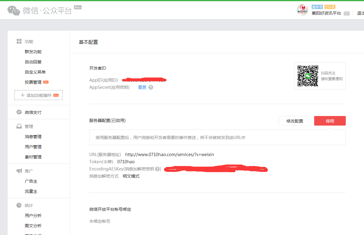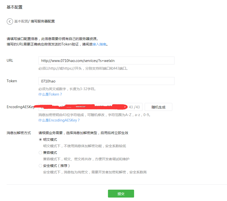 EncodingAESKey点随机生成 选明文模式或兼容模式 然后启用