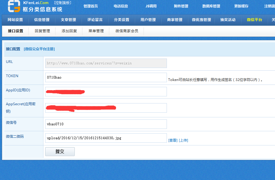 2、配置服务 URL填写你网站后台为新平台的URL , TOKEN自己填写对应