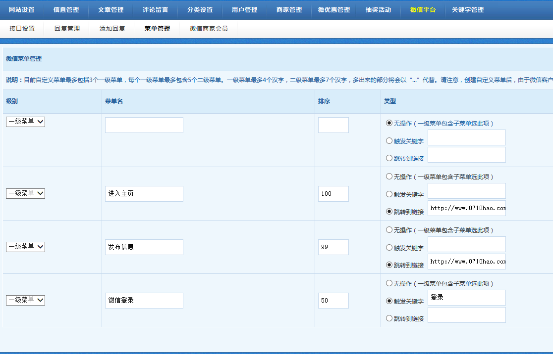 菜单管理 填写 你想要的菜单栏目 看图 微信登录 的点触发 登录 剩下的菜单你选跳转 填写你要跳转的页面 回复设置你可以自己添加~