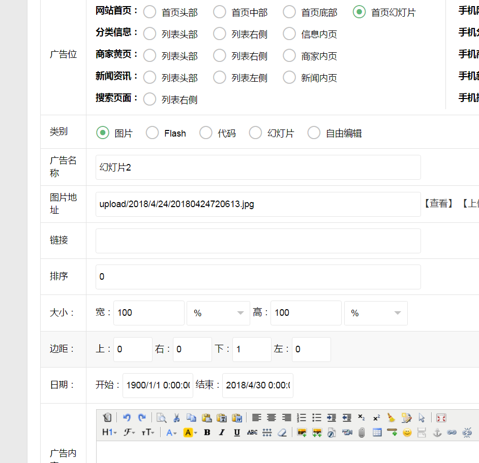 广告的类型选择为幻灯片就可以了