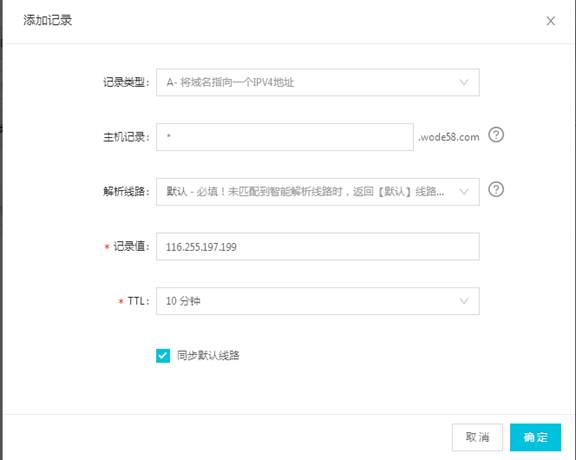 记录值填写空间IP地址 TTL设置为默认