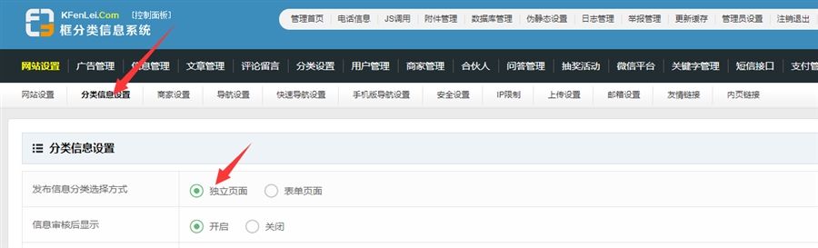 如果修改设置时出错,把上面的发布信息分类选择方式 设置为独立页面就可以了